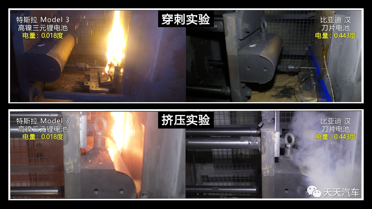 近期,网上热传一条比亚迪汉刀片电池与特斯拉model3高镍三元锂电池的对比视频,视频从针刺、挤压和炉温三个实验对比了两种电池的安全性。从视频中可以看出,刀片电池在三种实验条件下没有出现任何剧烈的自燃或者爆炸等热失控现象,而特斯拉的高镍三元锂电池在这三个实验中,无一例外地都出现了爆燃。