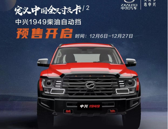 近日,我们从官方获悉,中兴1949柴油自动挡车型正式开启预售,新车预售价格区间为15.99万-18.69万元。预售时间为12月6日-12月27日。