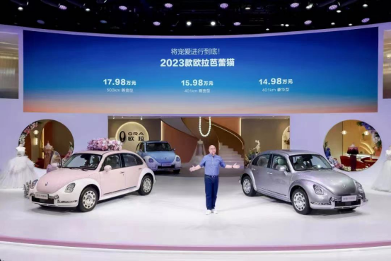 在2023上海车展上,欧拉汽车旗下2023款欧拉芭蕾猫正式上市。新车共推出3款配置,售价区间为14.98-17.98万元。作为年度改款车型,新车在外观和内饰设计上整体与老款车型保持一致,其主要针对配置进行了优化升级。
