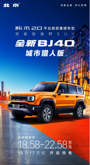 千呼万唤始出来!10月17日,全新BJ40城市猎人版正式预售,车型分为先锋型,预售价格为185800元;侠客型,预售价格为205800元;至尊型,预售价格为225800元。价格一出,迅速出圈,一直饱受关注,实力能打的全新BJ40,这一次再次向广大新老用户拿出了十足的诚意。