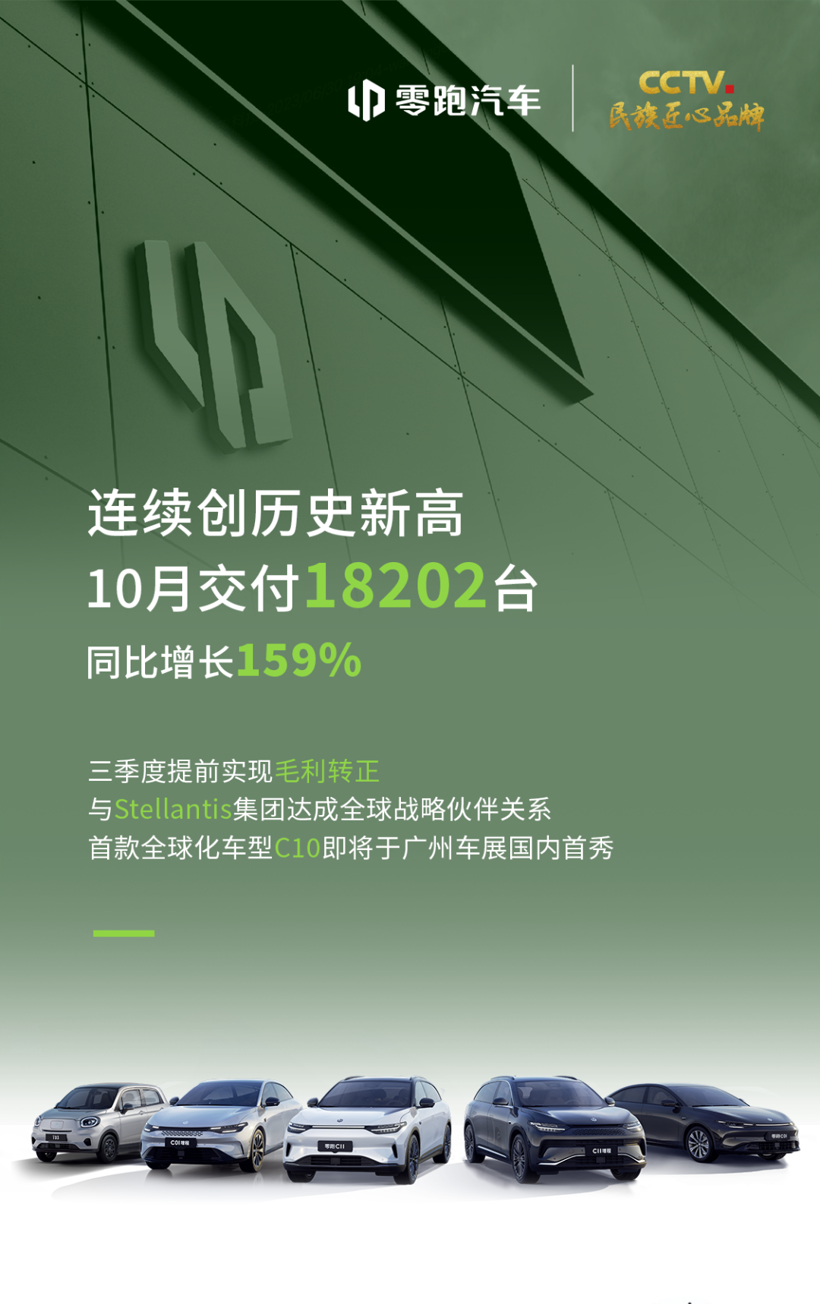 零跑汽车10月共计交付18202辆,同比增长159.1%,环比增长15.2%,连续创历史新高。零跑汽车联席总裁武强表示,预计2023年第四季度,零跑汽车能达到平均每月18000辆的交付。