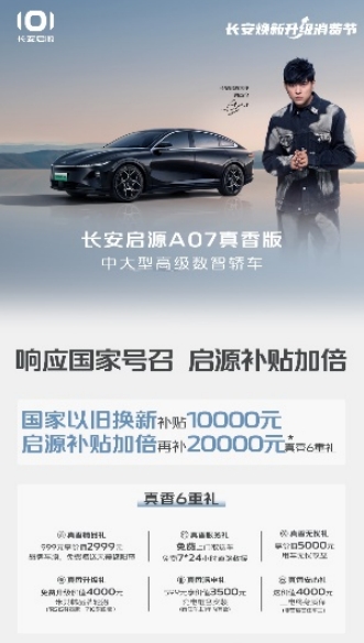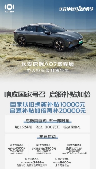即日起购长安启源A07真香版,享国家以旧换新补贴10000元,启源补贴加倍再补20000元真香6重礼;购买启源A07增程版,在享国家以旧换新补贴10000元的基础上,启源补贴加倍再补20000元,并且还可以享受0首付,送交强险,送价值1000元五一畅游现金礼等真香好礼!