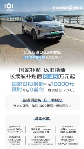 为“9万级双生电混长续航SUV”的启源Q05真香版,享国家以旧换新补贴10000元后,长续航仅需8.45万元,限时开启0首付,月供低至1700元,同步开启“五一限时权益”,送交强险,送价值1000元五一畅游现金礼,让您五一出行无忧。