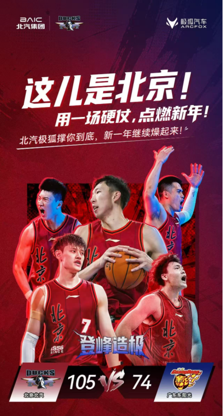 此次胜利,是2026年的“开门红”,球员们火力全开,让北汽精神在新年首日熠熠生辉。“神仙队友”北汽极狐则携广大球迷共赴热爱之约,为男篮队员摇旗呐喊,让这场开年大战,成为集竞技激情与品牌温度于一体的欢乐盛会。