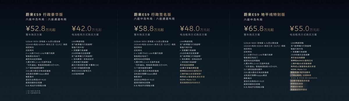 (4月9日,杭州)科技行政旗舰SUV——蔚来ES9今天在杭州正式发布并开启预售。ES9是蔚来十一年体系创新的集大成之作,是智能电动行政旗舰SUV品类的开创者。ES9行政豪华版预售价528,000元起,采用BaaS电池租用方式购买,预售价420,000元起;行政签名版预售价588,000元起,采用BaaS电池租用方式购买,预售价480,000元起,地平线特别版预售价658,000元起,采用BaaS电池租用方式购买,预售价550,000元起。