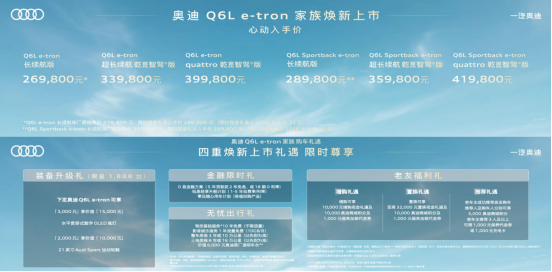 具体来看,新上市的奥迪A6Le-tron共推出4款配置,售价区间为30.98万元至43.98万元,包括长续航版、超长续航版、首发乾崑智驾版及顶配的quattro乾崑智驾版。同步焕新的奥迪Q6Le-tron则提供了更丰富的车身形态与动力选择,其中Q6Le-tron提供三款配置,限时心动入手价从26.98万元到39.98万元;其轿跑SUV版本Q6LSportbacke-tron同样有三款配置,限时心动入手价区间为28.98万元至41.98万元。这样的价格体系覆盖了30万至45万的主流豪华纯电市场,并与各自的产品定位形成了清晰对应。