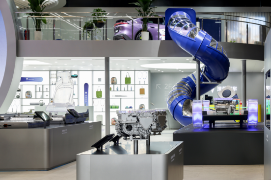 当科技性能与运动美学在驾驶中碰撞,深蓝汽车不仅是车,更是年轻态人群彰显个性、释放态度的潮流秀场。深蓝汽车展台整体采用极简未来主义风格,并第一次在展台设计上将品牌视觉调性的VI色进行应用与强化表达,通过“无界蓝”“量子蓝”“探索黄”等色彩碰撞与搭配,凸显品牌年轻科技运动的调性;裸眼3D大屏,呈现深蓝汽车LOGO及车型,品牌科技感调性拉满。同时精心设置L06驾趣体验、螺旋滑梯、车衣换色展示、拳击沙袋等年轻化互动装置,打破传统车展的单调模式,打造“可玩的深蓝社区”,让观众从“看车展”真正变成“玩车展”。